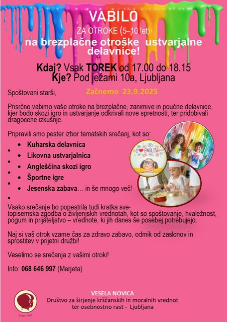 Vabimo otroke, stare od 5 do 10 let, na ustvarjalne brezplačne delavnice, kjer bodo skozi igro spoznavali nove veščine, ustvarjali in raziskovali.